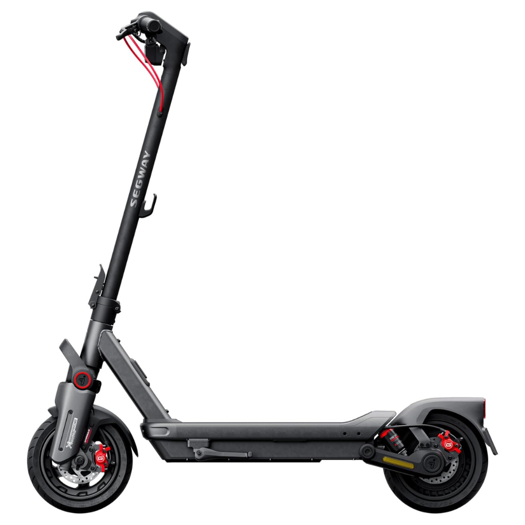 Imaginez-vous arriver à un rendez-vous sur ce bolide au look résolument contemporain. La robe principale noire est rehaussée de touches rouges dynamiques, notamment sur les étriers de frein et les câbles apparents, conférant à cette trottinette électrique un caractère sportif et affirmé. Les lignes nettes et anguleuses du cadre traduisent une conception à la fois élégante et fonctionnelle, tandis que les finitions soignées témoignent du soin apporté par Segway à chaque détail.